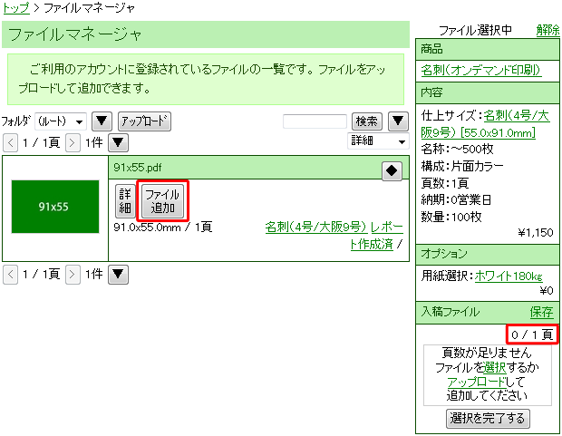 ファイルマネージャ画面に移動します。 入稿済みのファイルを選択して、「ファイルを追加」してください。 追加できるファイルの数は「0/1頁」と枠内に表示されています。