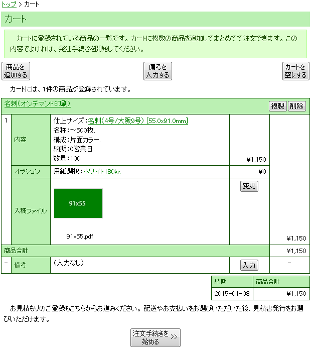 カートの商品にファイルが追加されました。 この状態で入稿が完了していますので、注文を進めることができるようになりました。