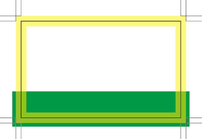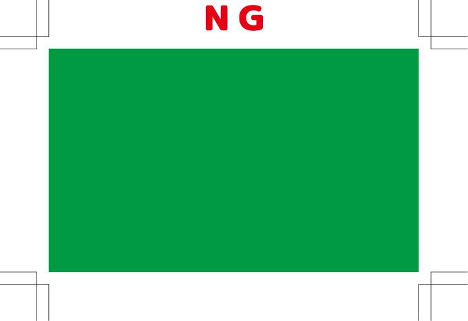 「NG」となるデータです。 “緑の背景”が仕上がりまでしかなく、塗り足しに届いていません。 断裁ズレにより下地が見えてしまう恐れがあります。