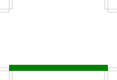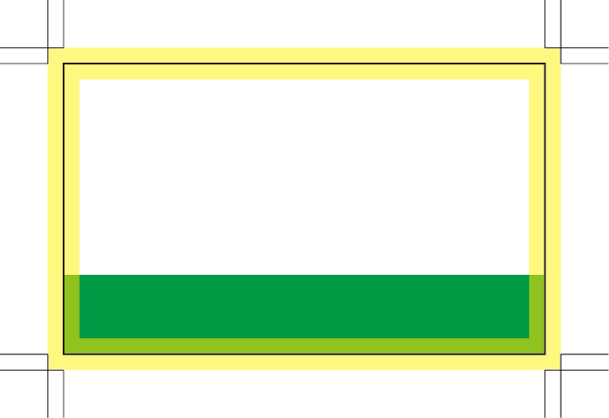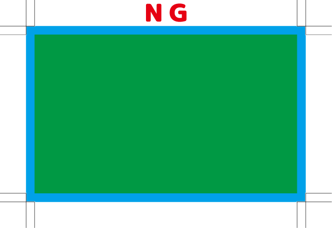 「NG」となるデータです。 “緑の背景”の外側に、“青の背景”が追加されています。 断裁ズレにより青色が見えてしまう恐れがあります。 仕上がりの外側を適当な色で埋めることが塗り足しではありません。 “緑の背景”がトリミング済みは、やむなくこの様な対応となることがありますが、トリミング前の素材を用意することで防止できます。