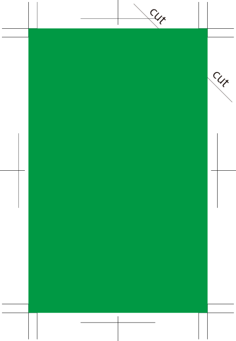 加工の指示は文字で説明するのではなく図柄で明示してください。 理想的な加工指示は入稿データにカットトンボを追加する、妥協した加工指示はデザイン上で色分けをしてください。 以下の画像を参考にしてください。