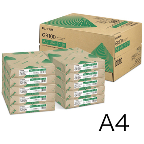 規格:A4 寸法:210x297mm 内容:GAAA6377(500枚/冊)x10冊 坪量:67g/m2 紙厚:96μm ISO白色度:70% 古紙パルプ配合率:100% グリーン購入法適合(総合評価値:85) グリーンマーク エコ商品ねっと登録 生産:日本(国産) 製造:富士フィルムBI 銘柄:GR100 品番:ZGAA1284 JAN:4985653012791 入数:5,000枚 外装:箱(段ボール)