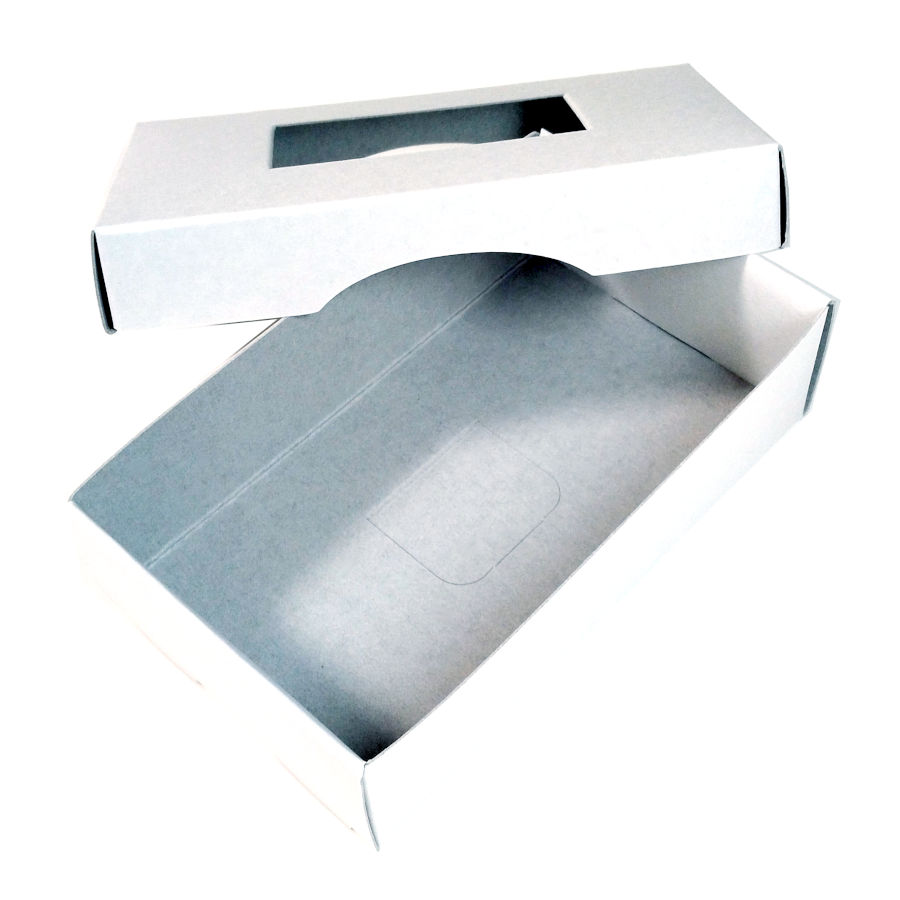 58X89mm、フタソコ式の紙箱です。 フタとソコの1組が10枚入りで1セット。 展開状態で納品します。 内面にはサイズがわかる印が押されます。